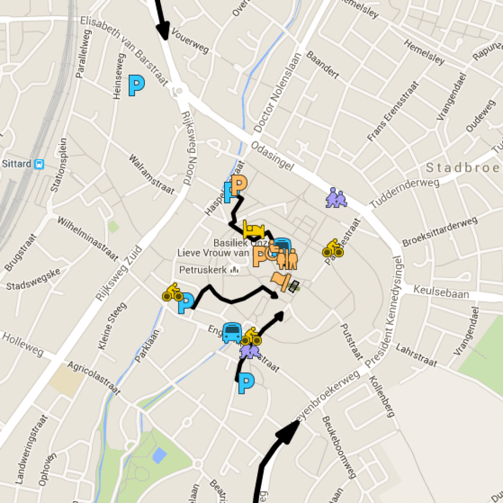 De parkeerplaats Pitground (autonavigatie: Poststraat 1, Sittard) ligt op een kleine 2 km van de Markt. De parkeerplaats is vanaf de autosnelweg A2 het best bereikbaar via afslag 48 (Urmond, Stein, Sittard) en de N294. Vanaf de provinciale weg N276 is het de afslag ‘Sittard, Autoboulevard’.